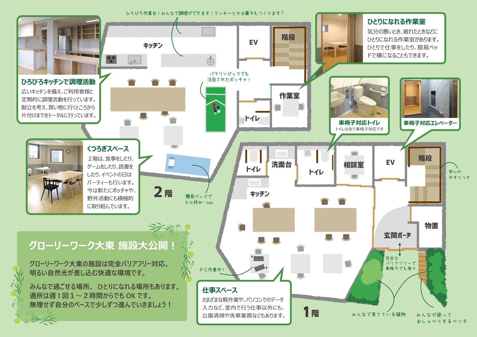 2階に広いキッチンを備え、施設内でもさまざま活動体験ができる、完全バリアフリー対応施設です。