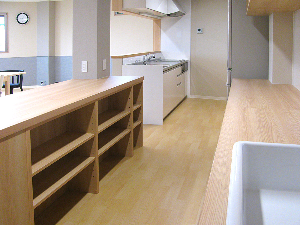 みんなで料理を作ることもできる広いキッチンスペースを確保しています。ひとりになれる場所