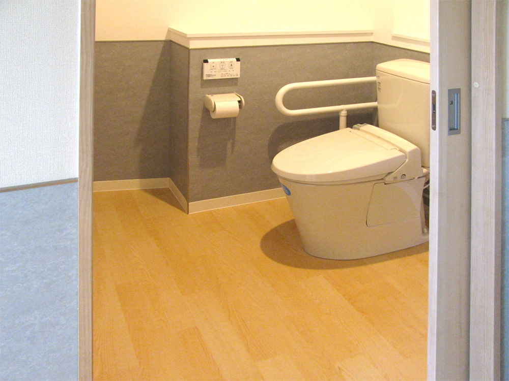 車いすでも使いやすいトイレです。引き戸で出入りもしやすくなっています。